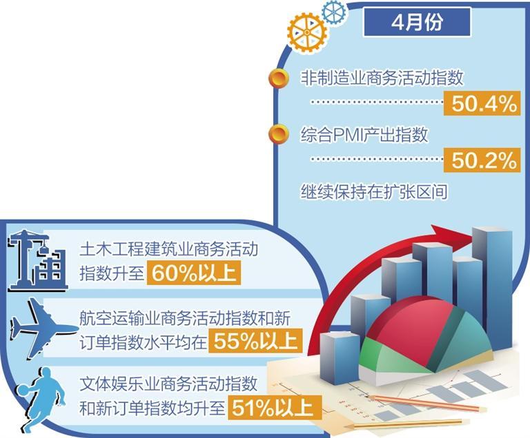 制造业PMI有所回落,非制造业PMI继续扩张—— 我国经济总体产出持续扩张 国家统计局服务业调查中心、中国物流与采购联合会近日发布数据显示,4月份,制造业采购经理指数为49%,比上月下降1.5个百分点;非制造业商务活动指数和综合PMI产出指数分别为50.4%和50.2%,继续保持在扩张区间。 专家表示,受贸易环境不确定性增大影响,主要经济体制造业景气度普遍位于收缩区间。我国超大规模市场、完备产业体系优势持续发挥作用,新动能生产需求保持稳中有增,有效抵御外部冲击,经济长期向好基本面没有改变。 外贸环境影响整体可控 4月份,受前期制造业较快增长形成较高基数叠加外部环境急剧变化等因素影响,制造业采购经理指数为49%,在连续2个月运行在扩张区间后回落至临界点以下。 东方金诚首席宏观分析师王青认为,4月制造业PMI指数下降1.5个百分点,符合预期。主要原因有两方面,一是外部环境急剧变化,对制造业供需两端形成较大拖累。二是季节性因素。3月是制造业旺季,4月制造业景气度会有季节性下行。 “4月份外贸环境的变化给我国制造业带来一定扰动,市场需求和企业生产短期有所放缓,但我国经济底座依然稳固。”中国物流信息中心专家文韬表示,一方面,我国超大规模市场、完备产业链供应链体系等优势持续发挥作用,有效抵御了外部冲击,保障了经济的相对稳定运行。另一方面,前期我国的系列政策有力带动经济行稳致远。 文韬表示,4月份制造业新订单指数水平明显高于新出口订单指数,新订单指数环比降幅也小于新出口订单指数降幅,显示在出口订单较上月明显下降的情况下制造业整体接单较上月仅有小幅收缩,对比之下说明国内需求稳定释放,缓解了出口订单下行的压力。我国超大规模市场对制造业起到了坚实支撑作用,较好稳住市场需求底盘,外贸环境对我国制造业出口的影响整体可控。 外贸环境的变化,给企业预期带来一定扰动,但从指数水平看,企业对后市预期仍保持乐观,生产经营活动预期指数仍保持在52%以上。分行业看,装备制造业生产经营活动预期指数保持在55%以上,消费品制造业生产经营活动预期指数保持在54%以上,显示新动能和消费品制造业企业对后市普遍保持较好信心。 非制造业PMI保持扩张 4月份,非制造业商务活动指数为50.4%,比上月下降0.4个百分点。中国物流与采购联合会副会长何辉表示,4月份非制造业商务活动指数虽较上月下降,但今年以来持续保持在略高于50%的水平,显示非制造业在扩张区间平稳运行。 基础建设相关实物工作量加快增长。4月,建筑业商务活动指数虽较上月有所下降,但仍在52%附近,意味着建筑业施工活动保持增长。特别是基础建设投资相关行业活动表现突出。土木工程建筑业商务活动指数较上月上升超5个百分点,升至60%以上,连续3个月在54%以上,基础建设投资向实物工作量转化的速度有所加快。 在清明小长假带动下,4月份居民出行、休闲和出游意愿有所提升。从出行看,航空运输业商务活动指数和新订单指数较上月均有明显上升,指数水平均在55%以上,显示居民远距离出行意愿较强;从休闲消费看,文体娱乐业商务活动指数和新订单指数均较上月明显上升,均升至51%以上,显示居民假期休闲消费意愿有所提升。 中国物流信息中心专家武威表示,二季度非制造业开局平稳,投资、消费和新动能相关活动均有积极表现。虽然短期面对全球不确定性因素扰动,但我国经济推进平稳有序,随着一系列稳经济相关政策红利的加快释放,投资与消费相关活动具备继续平稳向好运行基础。从预期看,4月份,业务活动预期指数虽较上月下降,但仍在56%的较高水平,且连续7个月运行在55%以上,显示非制造业企业对未来市场运行保持乐观判断。 长期向好的基本面没有变 4月份,综合PMI产出指数为50.2%,比上月下降1.2个百分点,仍高于临界点,表明我国企业生产经营活动总体保持扩张。 国家统计局服务业调查中心高级统计师赵庆河表示,总体看,综合PMI产出指数自2023年1月以来始终位于临界点以上,我国经济总体产出持续扩张,长期向好的基本面没有改变。受外部环境急剧变化等因素影响,4月份制造业采购经理指数有所回落,但高技术制造业等相关行业继续保持扩张,以内销为主的制造业企业生产经营总体稳定。 “从全球范围看,贸易战、关税战没有赢家,受贸易环境不确定性增大影响,主要经济体制造业景气度普遍位于收缩区间。”赵庆河表示,下阶段,要统筹国内经济工作和国际经贸斗争,以高质量发展的确定性应对外部环境急剧变化的不确定性。 国务院发展研究中心研究员张立群认为,要加紧实施更加积极有为的宏观经济政策,特别要显著加大政府公共产品投资力度;带动企业生产投资活跃,就业形势改善,居民收入增长加快。依靠政府公共产品、公共服务投资力度显著加大,使企业投资和居民消费显著回暖,着力巩固增强经济回升向好的基础和动能。 文韬认为,中央已经作出重要部署,明确了着力“四稳”工作、加紧实施更加积极有为的宏观政策、增强消费对经济增长的拉动作用等工作。随着这些政策逐渐形成实物工作量,加上我国宏观经济本身的韧性持续发挥作用,我国经济将稳定运行在高质量发展轨道上。(记者 熊丽)